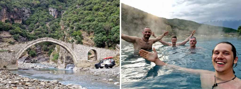 Tali Tiranában a reptéren! Innen a permeti, folyóparti táborunkba utazunk. A napunkba belefér még egy kis ázakodás a néhány természetes melegvizű medencében a hegyek között.