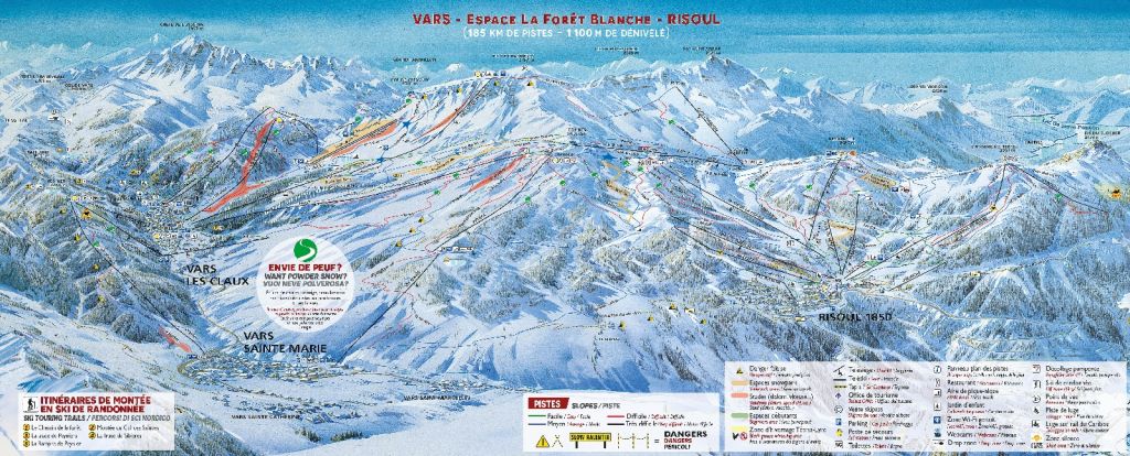 Az 1850 méteren fekvő Risoul és a hasonló magasságokba érő Vars 1990 óta együttesen alkotják a Domaine de La Forêt Blanche elnevezésű sírégiót. Mindkét település egy-egy központot alkot, ahol minden megtalálható, így mindkettő egyformán jó kiindulópontja a síelésnek. Ne tévesszen meg, hogy pár évvel ezelőtt a két rendszer tulajdonosai nem tudtak megegyezni és a terep nem volt összesíelhető. Mára békesség van, és a síbérlet mindkét síterepre érvényes.